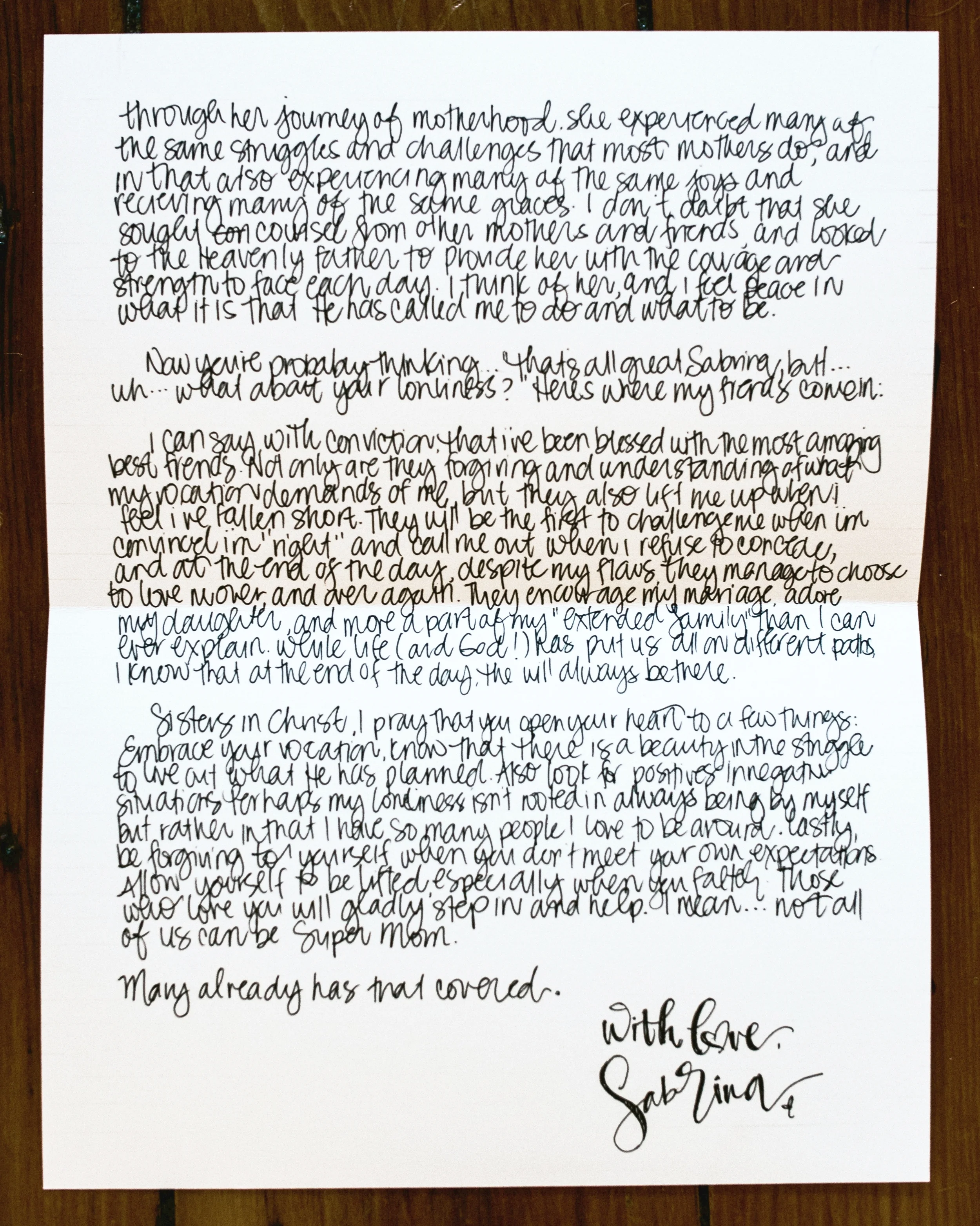 Sisters in Christ, I pray that you open your heart to a few things: embrace your vocation. Know that there is a beauty in the struggle to live out what it is that He has planned. Also, look for the positives in negative situations. Perhaps my loneliness isn’t rooted in always being by myself, but rather in that I have so many people who I love to be around. Lastly, be forgiving to yourself when you don’t meet your own expectations. Allow yourself to be lifted, especially when you falter. Those who love you will gladly step in and help. I mean…not all of us can be Super Mom.