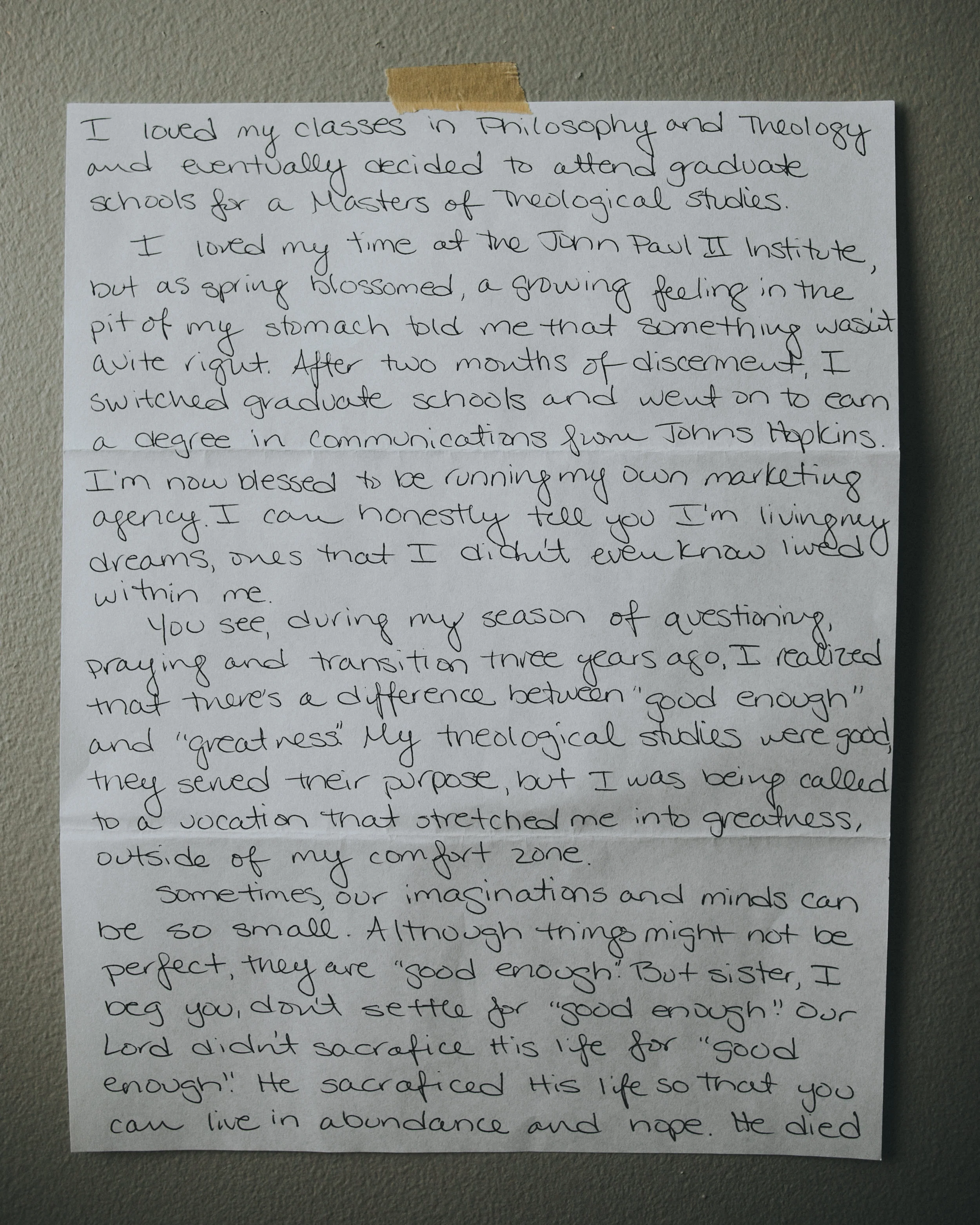 I loved my time at the John Paul II Institute, but as spring blossomed, a growing feeling in the pit of my stomach told me that something wasn’t quite right. After two months of discernment, I switched graduate schools and went on to earn a degree in Communications from Johns Hopkins. I’m now blessed enough to be running my own marketing agency. I can honestly tell you I’m living my dreams, ones that I didn’t even know lived within me.